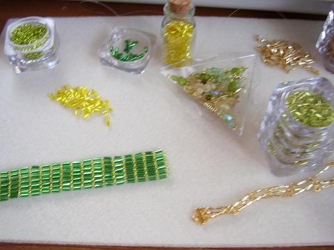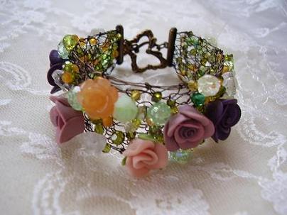 既製のワイヤー製ブレス(金古美)に色とりどりのビーズを編みつけました。フィモ(樹脂粘土)の花をメインに秋らしいビーズを編みこんでみました。フィモの花も抑えの効いた色だったので秋でも花畑のようになりました。 留め具は、秋なのに蝶のマンテルを使いました。 ビーズパーツ販売アクセサリー通り