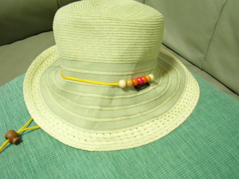 ビーズアクセサリーのカテには失礼かと思いながらも見ていただきますお許しを~実はワタクシ頭周囲が小さくて帽子を選ぶのにはとても困りますこの帽子もSサイズで気に入って買ったのですがやはり少~し大きいようでちょっとの風でも浮いてしまいますそこでハズかしいけど紐をつけましたゴムよりいいかと・・・紐だけって言うのも芸がないのでウッドビーズを通しましたこの帽子をかぶって週末はおでかけ~