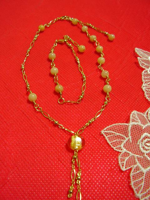 イエロージェイドとヴェネチアンでネックレス華奢なチェーンを使ったネックレスがつくりたかったのですが、イエロージェイドをめがね留めしたものが10センチくらいあったのでゴールドのチェーンをつなげて、センターに春に買ったヴェネチアンを一個だけ置いて短いラリエット風にしました。 イエロージェイドの配置はテキトーに配していますそれにしても、めがね留めは苦手ですチェーンもイエロージェイドも余ったので、ブレスレットも作っちゃいました。かなりいいかげんな作品です 半貴石イエロージェイド ラウンド型 6ミリ(4個入り) 《ビーズ アクセサリー》