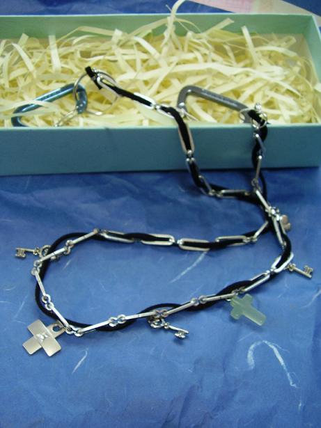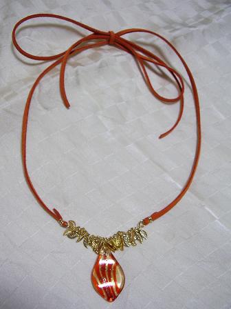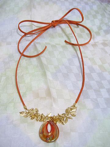 かなり前に購入して、ほったらかしてあったお気に入りのヴェネチア風のガラス製のペンダントトップを使ってみました。丸カン付きなので、革紐やチェーンを通すだけで、出来上がるトップなのですが、ちょっと豪華に飾り付けました。豪華なチェーンを一部に使って、お好みの長さに調節できるように、オレンジの革ひもリボンでネック部分をつくりました。もうひとつペンダントトップがあるので、同じように作ってみようと思います。ただし、一箇所不満なところがあるので、そこの部分をもう少し工夫して…や&も