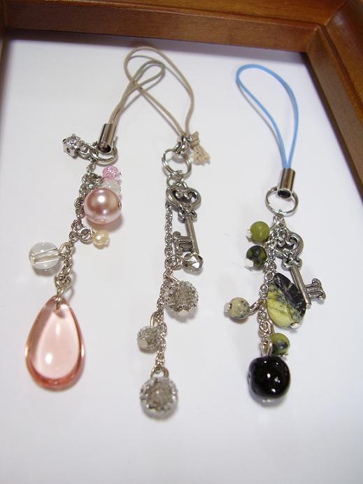 最近は、はんぱビーズや余りチャームを使って、ストラップ作りに励んでいます。チェーンも余りモノで・・・。ただTピンでビーズを適当に付けるだけ。配置さえ決めれば、超不器用な私でも15分くらいで出来上がります。これがけっこう惜しげもなくプレゼントできるもので・・・。Photoを撮っているのがこれだけ~。で、あと三つ四つ作ってました。今年最初の忘年会で、もうプレゼントしてしまったのでPhoto残し忘れました。右側のストラップなんてちょっと贅沢に仕上がっています。実は、ほとんどイエローターコイズです。さしあげたら皆さん喜んで受け取ってくださいます。ビーズの在庫を減らして新しい年を迎えるのに、オススメもうは決まりましたか