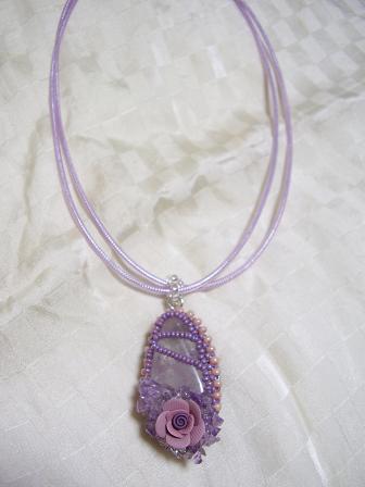 久しぶりに、テグスであみあみしました。取り掛かったのは確か9月、や~っと出来ました。約2ヶ月はほったらかし(得意なんです)天然石つかみ取り(?)で購入した透明の石(水晶系)をアミくるんでみました。(コレ結構重くてかなり苦労しました)FIMO製のお花をサザレに埋めて・・・(尚重くなるのに…)
