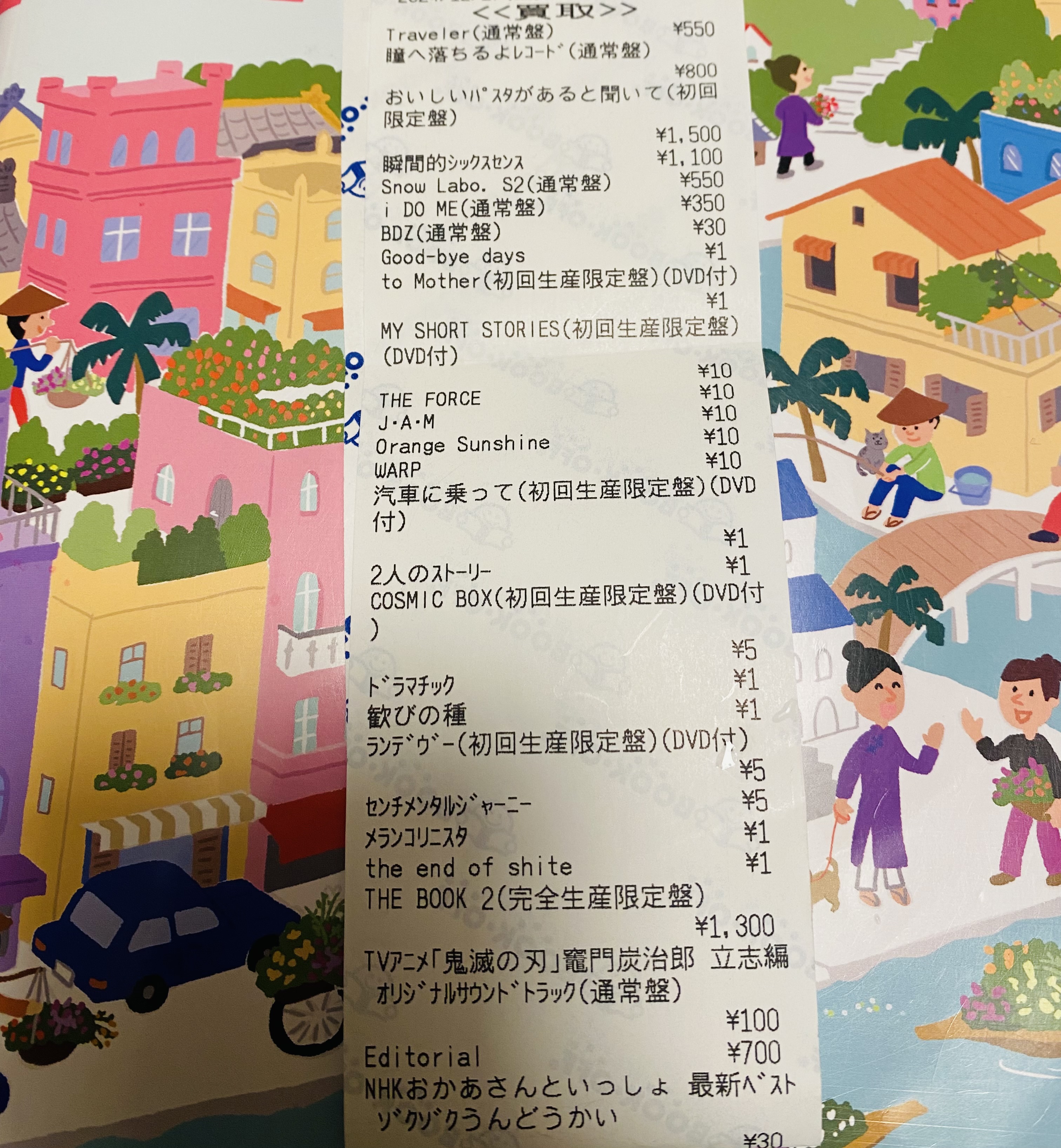 あいみょん、YOASOBI、髭ダンはまあまあ高額査定でした。スノは思っていたより低かった。店頭にたくさん在庫あったから仕方ないかな。