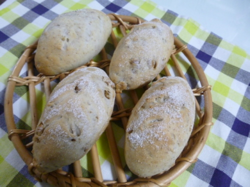 本日の試食パンは、セーグル・ノアです。クルミたっぷりのライ麦パンです。コロンとフットボール形に成形して、とってもかわいいパンです。ほんのり甘さもあって、朝食にピッタリのパン!!レッスンは、Yさんがクアトロツイストです。クリームチーズにカマンベールチーズと、チーズ好きにはたまらないパンですね~捏ねも成形も、ばっちりできました!!今夜のワインが美味しくなりますよ!!Iさんは、ホワイトフロマージュです。ほうれん草の混ぜ込みと、中のホワイトクリームの包み込みが大変でしたね~でも、とってもおいしそうに焼きあがってます。熱々を食べてくださいね~今日は、日差しも出ていましたが・・・風が強い!!洗濯物が飛んでいかないか、心配していたお二人!!大丈夫でしたか???発酵中には、おおいたのパン屋さんの話で盛り上がり、楽しいレッスンでした。4月に、また情報交換しましょうね~