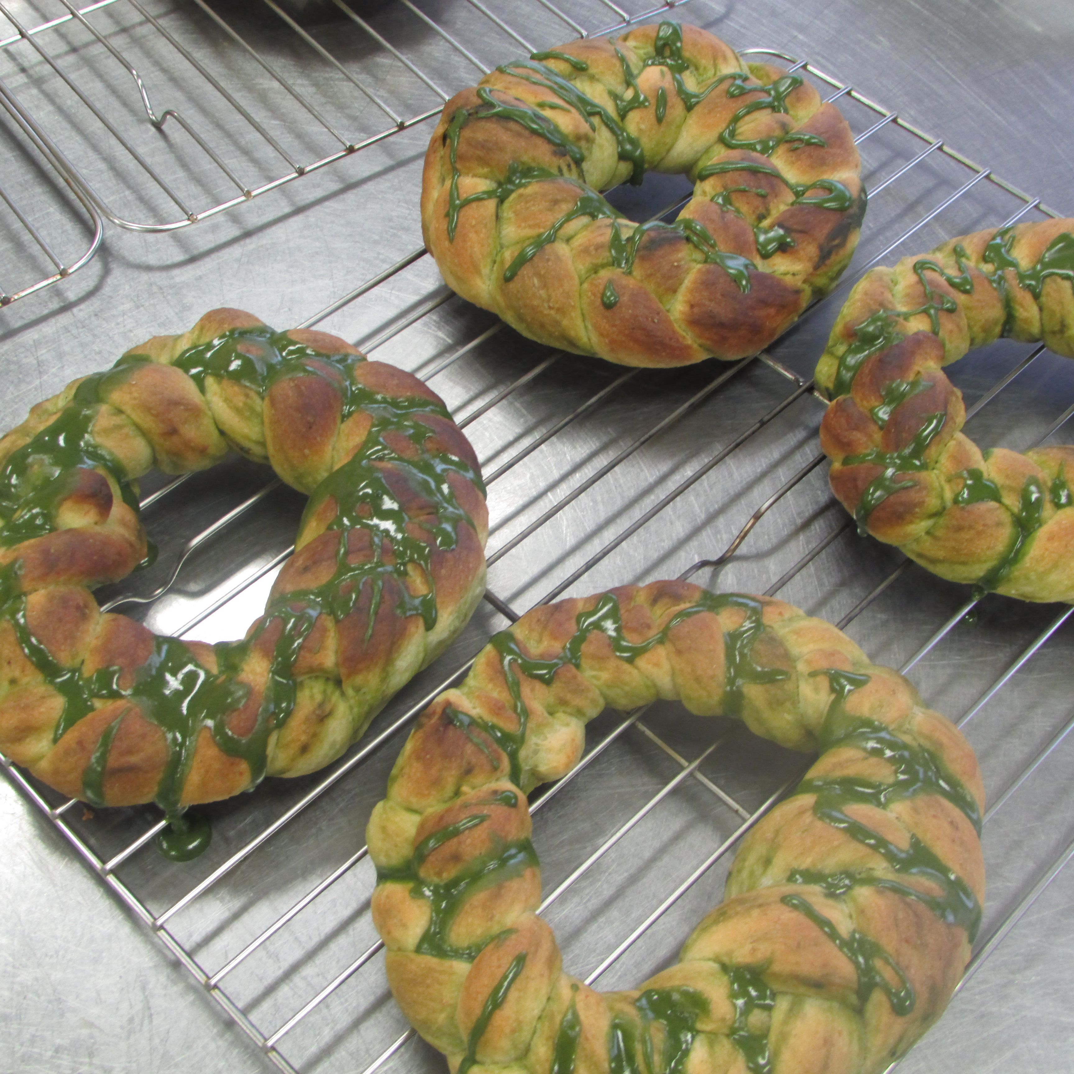 今日は、別府の南部地区公民館でのパン講座でした。 作ったパンは、抹茶リースです。全粒粉入りの生地に抹茶パウダーを混ぜ合わせます。三つ編みに成形して、リース型に!!仕上げは、粉砂糖に抹茶パウダーを混ぜ合わせて作った抹茶アイシングをかけて出来上がり!!今日は、お好みで色々なサイズのリースを作ってもらいました。アイシングも生徒のみなさん、水加減に注意して、いい感じに!!焼き上がりは、思い思いのかごに入れてお持ち帰りです。外は雨でしたが、部屋の中は笑いありのいい雰囲気。楽しい時間でした。今年の南部地区公民館での講座は、今日で終了です。次回は、1月。バレンタインデーに向けて、チョコレートのパンを作ります。良いお年をお迎えください。