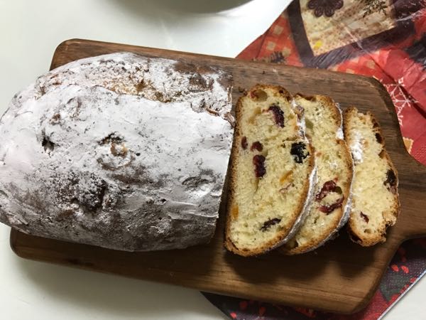 クリスマス🎄のパン、シュトーレンを焼きました💕😄 ラム酒漬けレーズン、オレンジピール、クランベリーにアンゼリカ、そしてアーモンドをたっぷり混ぜ込みました(^。^) 焼きあがったパンに仕上げのバターを塗って、粉糖をふりかけたら、可愛くラッピング💝 クリスマスのプレゼント🎄🎄🎁🎁です。