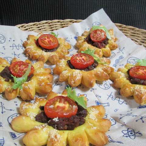 先週焼いたパン~ひまわりのトマトカレーパン・・・ターメリック入りの生地を可愛くひまわりの形に成型。トマト入りカレーをのせて、さらにトマトの輪切りをのせて。可愛く焼き上がり!!キーマカレーのクロックムッシュ・・・生地、カレー、生地、カレーと重ねて・・・仕上げにホワイトソース&チーズ。食べ応えのあるパン。ベリーチーズキューブ・・・冷凍ベリー入りの生地に、ラズベリージャム&クリームチーズをのせて。くるくる巻いて、キューブ型へ。仕上げにワッフルシュガー。可愛く焼き上がり。