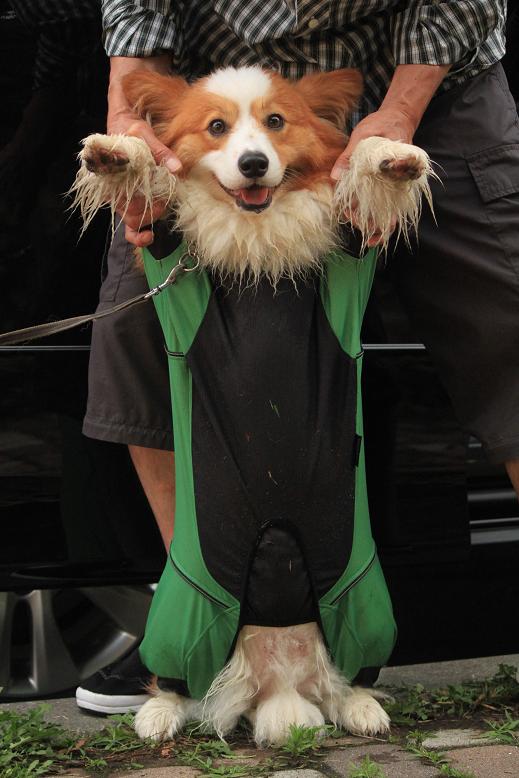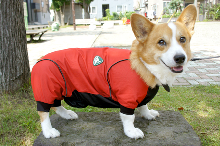 こんにちは。サカガミでございますコーギー飼いの皆様~ついに☆出ましたね!レインドッグガード コーギーサイズ私もコーギーと暮らしております一人です。ダックス同様、とにかく汚れる犬種と言えばコーギー!!です。17キロ♂ CGLサイズ着用うちはさらにフラッフィー(ロン毛)なので汚れるなんてものじゃありません♪雨の日はバッシャバッシャ☆自分のお腹に自分で泥水掛けるように歩きます(笑)足が短い犬種の宿命ですねぇ。。マック君 13キロ♂ CGMサイズ着用なのでコーギーサイズの登場はとっても嬉しいです。私のレインドッグガードお気に入りポイントは!前胸~お腹までが黒い生地を使用しているところここって一番汚れる部分なんですよね~!!コーギーやダックスの「服」ってこの部分が汚れてしまって、なかなか洗っても落ちず、黒ずんでしまうんですよぉだから黒い生地で汚れが目立たないのはとってもありがたい!!もう汚れなんて怖くないっ!!雨の日だって、雨上がりだって思いっきり走らせてあげたいですよねーワンコの笑顔が見たいから♪サカガミ