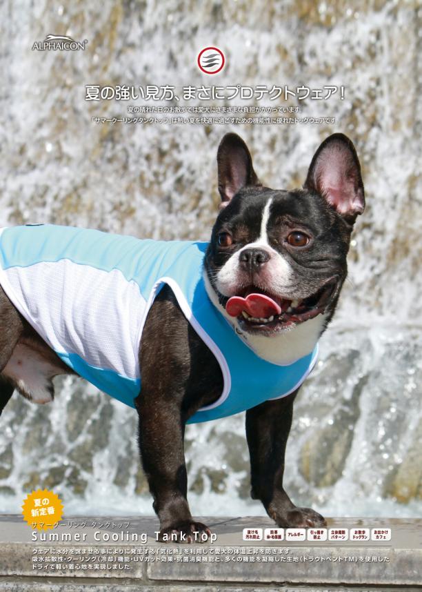 こんにちは。sadakataです♪夏大好きな私ですが・・・札幌ではここ数日25度越えの日が続き、少しバテ気味でございます。。ワンコたちも暑さに負けずにお外で遊ばせたいですよね!そこでALPHAICONから夏シーズンに最適な機能的なDOG WEAR、『サマークーリングタンク』が発売になりました!!2層構造の生地で、少量の水(ペットボトルのキャップ1杯)で生地に水が拡散するので上昇した体温を気化熱によって下げてくれる機能なのです。暑い夏でも、何も着ていないより、可視光線・路面からの反射熱・紫外線からワンちゃんの体を守ってくれます!なんといっても涼しく快適な状態でお散歩できるんですよ♪風に吹かれるとさらに涼しさ倍増!!カラーは3色展開、サイズは16サイズ展開です。社内の女子スタッフはこの生地の切れ端を腕に巻いたり~首に巻いたり~とクーリングしております。。最近増量中のロブももちろんクーリング中。。。水に濡らして着せることで、熱中症などの対策に最適です!この夏ワンちゃんとのお出かけには欠かせないWEARになること間違いなしっ!!!近日中にWEBでも発売開始となります!sadakata