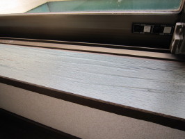 私達が住んでる両親の家は築15年位あちこち痛みが出てきてますが、父がかなりショックを受けたのは窓枠。天然木を使ってると信じてたのに・・・塩ビみたいなのが貼ってありまして、歳月が経つと共にはげてきましたよれてるのがわかります?ここはまだはげてはいませんが、ひどい所はバリバリにはげてます・・・で、DIYが得意の母が見事にリフォーム全部はいで残ったノリを取ってからニスを塗ってます横で見てた私は何もしてませんが・・・お見事