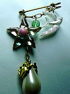 『サフィレット』という変色ガラスのルースでブローチを作りました。アンティークビーズの一種で自然光と人工光とでは印象が違います。製法が不明で現在は作られていないそうです。難しいことはさて置きとろんとした色合いが綺麗です蛍光灯の下で撮影しました。星みたいな枠に填め込んだ涙形のがサフィレットです。自然光の下での撮影です。真珠っぽいパーツとピンクと、ライトグリーンの丸いビーズはミリアム.ハスケルのアンティークビーズです。模造パールのビーズキャップ代わりに蛙のチャームを使ってみました蛙チャーム、頑張っていると思います