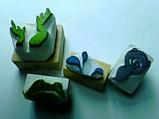久しぶりに消しゴムはんこを作りました!ちょっと、怪しげなパーツです(^^);『伊右衛門』の渦巻き柄てふきと蛙タオルの『湖の足』が私の妄想を掻き立てて…こうなりました。ちょっと渋かったかな。