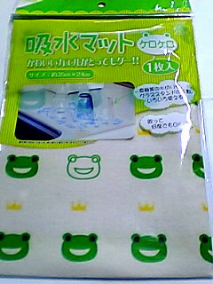 お馴染みセ●アのキッチングッズコーナーにて発見!!吸水マット ケロケロです。『特長』は洗い終えたコップ、陶器類を乗せて水切り。かわいいプリント柄でキッチンに華やかさをプラス。キッチンペーパー不要でエコロジー生活。だそうです。手洗いOKなので何度も使えます。凄いぞ!柄は三種類あって、格子のと,花のと、この蛙。柄の決定基準は分かりませんが、素晴らしい判断だと思います。しかも王冠付き言う事無しです。企画した人ありがとうですm(__)m発売元 株式会社フジサキ…ホームページのアドレスが書いてある。覗いてみると…おぉ~!ペンギンてぬぐいもここの会社のだ!!手芸グッズコーナーの株式会社ブレイズの仕事には感動してましたが、気が付かなかった、ぬかってました。ちなみにこれもそうでした。ケロケロキャッチと言ってレンジで熱くなった食器を取り出す皿つかみ。シリコン製のカエルです。マグネット付きなので出番までは冷蔵庫の扉にくっ付いて待機してます。ノドチンコまで描いてあって芸が細かいです♪