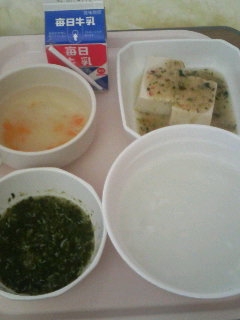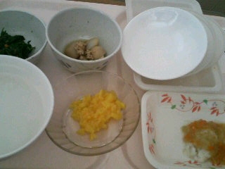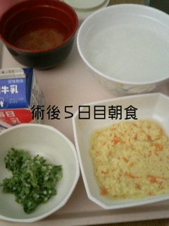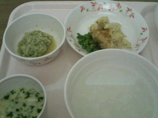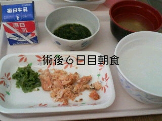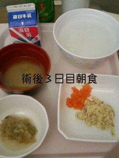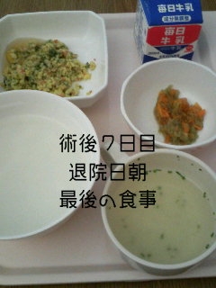 一週間病院のごはんを食べて感じたこと毎食といっていいほどにんじんがあらゆる味・形ででてくるそんなに体にええんかな?毎日魚料理たまにでてくる肉は鶏肉やっぱり肉より魚なんやな~毎食緑の野菜(煮物やお浸し)がでてくる生野菜は一度もでてきませんでした朝ご飯には必ず牛乳がつきます朝は牛乳飲まなあかんねやねなんかね食生活の在り方みたいなものがわかった気がする毎日おいしいごはんありがとうございましたおかげで顔色がよくなったとみんなにいわれます家に帰ったら主婦頑張ります!美味しいごはん家族に作ります! あー♪ワタス主婦の鏡ね♪(一言多い