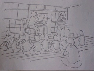 園児はあいにくの雨で、教室で遊んでいる。なかでも、新聞紙を自分たちで細かく切って、