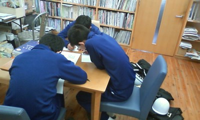 「一日中あちこち見学して最後に今日の感想文を、書く富田中学校の生徒諸君です。」