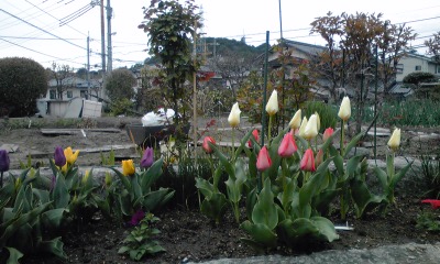 「母が植え、庭に咲いた初孫奈々ちゃんのナナをかたどったチューリップの花。」