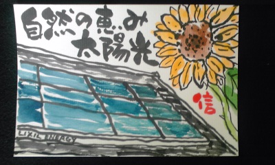 「絵てがみで描いた太陽光発電のパネルと、おひさまのイメージのあるひまわりです。」