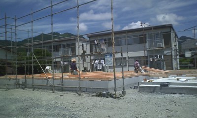 「周南市富田浜田の場所に立つ、O様邸の現場。大工さんが土台を敷きます。」