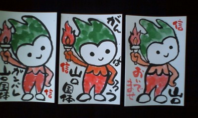 「山口国体のキャラクターちょるる。描くたびに違いますが、これが絵てがみでしょうか。」