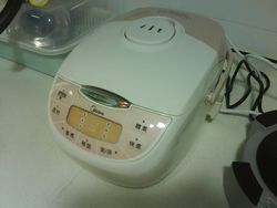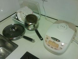 旦那す。本日にて休暇も終了!明日から、本格的にこちらの業務が始まります。・・・・・日本でのおいらの上司もこちらの赴任開始です。あーあ、日本での悪夢再来ですな。さて、そんな中で食事に困っているのはご存じだとは思いますが、夢のケンタッキー中心の生活では、「メタボリック」一直線なのであります。自炊生活に向けて、購入いたしました。←炊飯器でござるそうです。炊飯器を購入いたしました。これで、日本での生活再来です。健康的な生活を送ることこそ、仕事に専念できるってもんであります。・・・・・あ、米買ってないや。ついでに、リビング用にこれも購入。←扇風機でござんす。扇風機です。リビングにまだ冷房が入っていないので、それまでの間はこれでしのぐであります。しかもこれ99元だったので、日本円で1600円くらい。お安いですね。物も結構しっかりしている雰囲気がします。そんな感じで、うちがだんだん快適になってきております。・・・・・相変わらずシャワールームの下水の臭いはなおりませんがね。2008年5月4日 あーあ、休み終わっちゃうよ。
