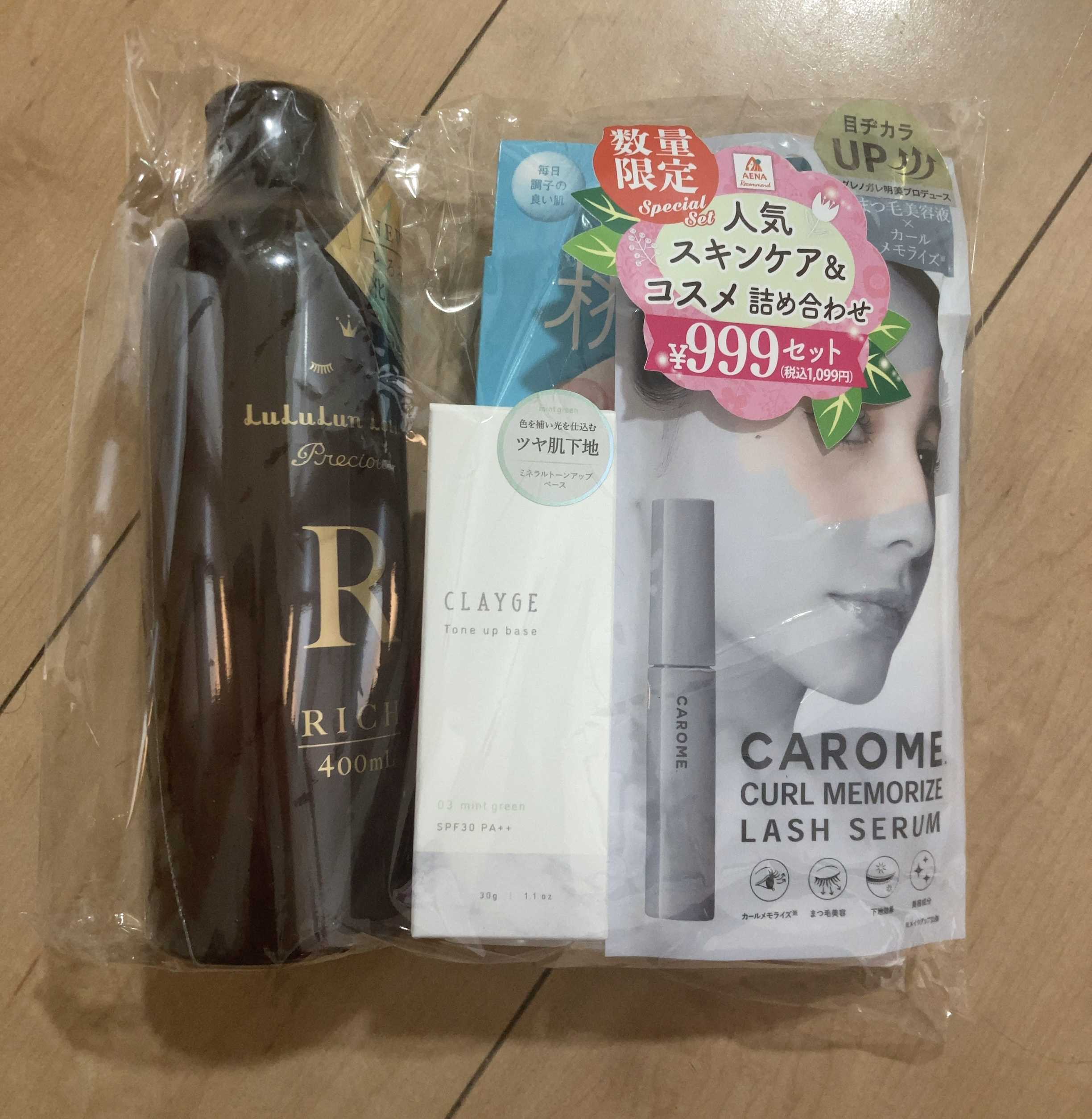 久々の福袋!アエナでスキンケア&コスメ 詰め合わせセット999円(税別)購入しました!4点セット!ルルルン プレシャスローションリッチこれだけで990円!?やったー!お得やん!桃セラミドパックこれだけで1000円!?お得過ぎん?CAROME カール メモライズ ラッシュ セラムこれだけで1099円!?なんでこんなお得なん?CLAYGE トーン アップ ベースえ?2420円?お得が過ぎる。色はミントグリーンで肌に合うかわからないけど、この4点で999円ってお得が過ぎる。次回行って、またあったら買って来よう。