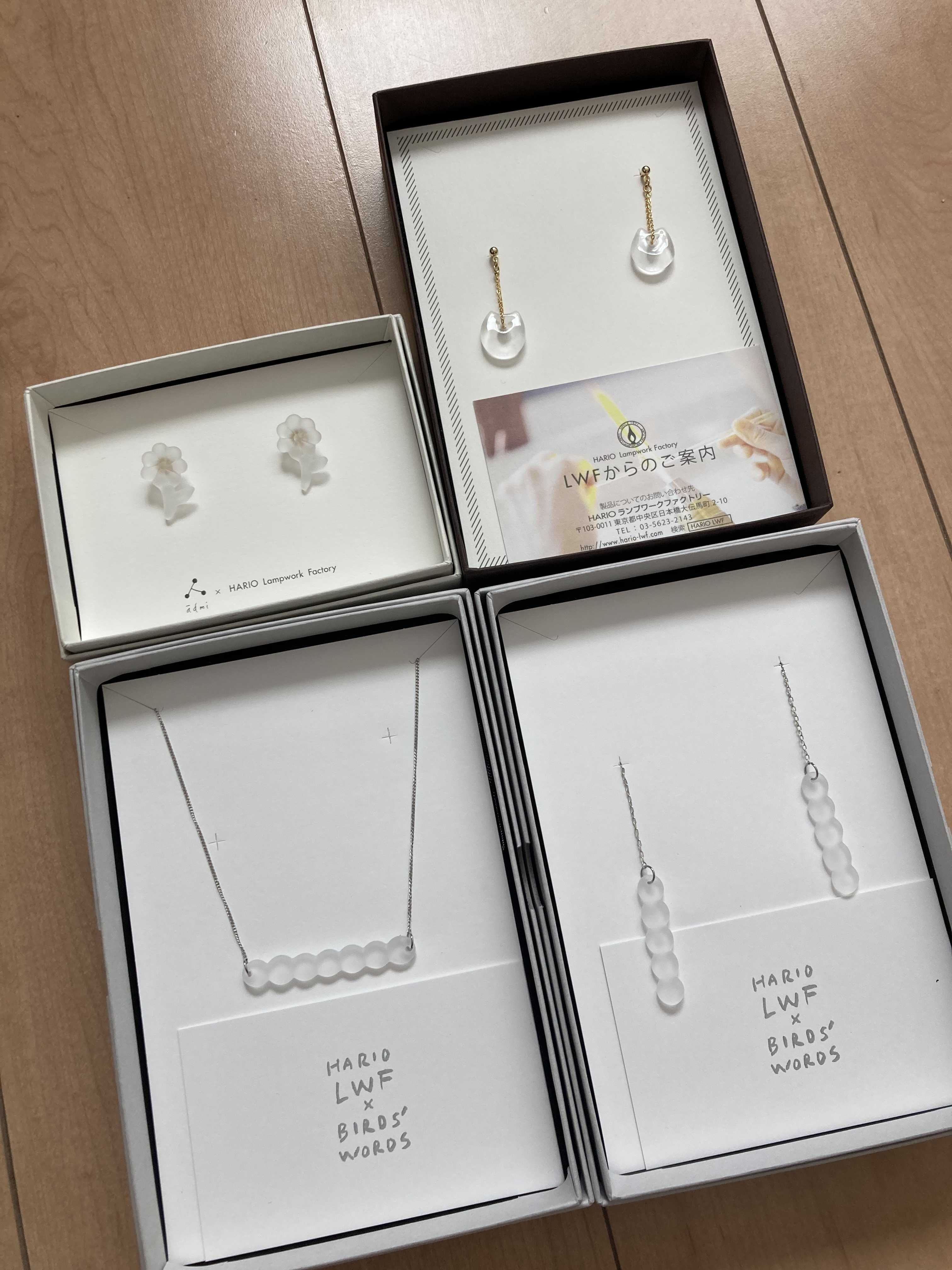 HARIO Lampwork factory の福袋今年は阪神百貨店のオンラインで購入しました!1/2に届き、早速開封しました!ピアス × 3ネックレス × 1BIRDS WORDS というシリーズのネックレスとピアス、とてもステキです!hanauta の お花モチーフのピアスとってもかわいいです!ピアス ポーション全てかわいくて、買って良かったです\(^o^)/