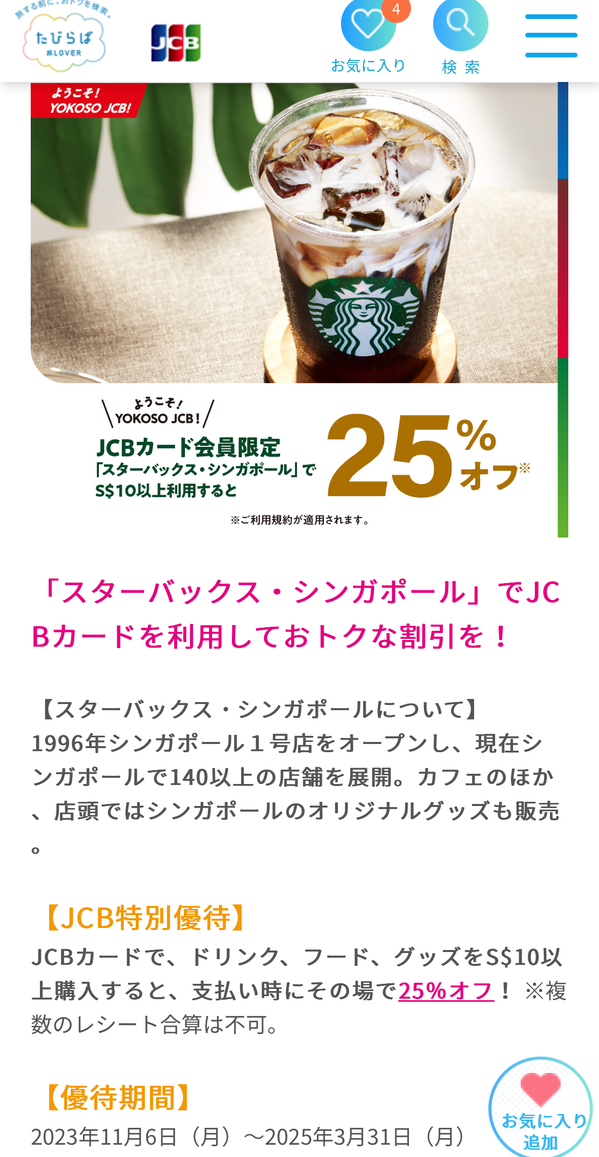 たまたまリバーワンダー近くのスタバを利用しましが、オーチャード通りのスタバとかでも使えるはず?対象店舗はお調べください。私が利用した時はレジに25パーセントオフのポップがありました。それを指差して、JCBカードで払ったら25パーセントオフで買えました。