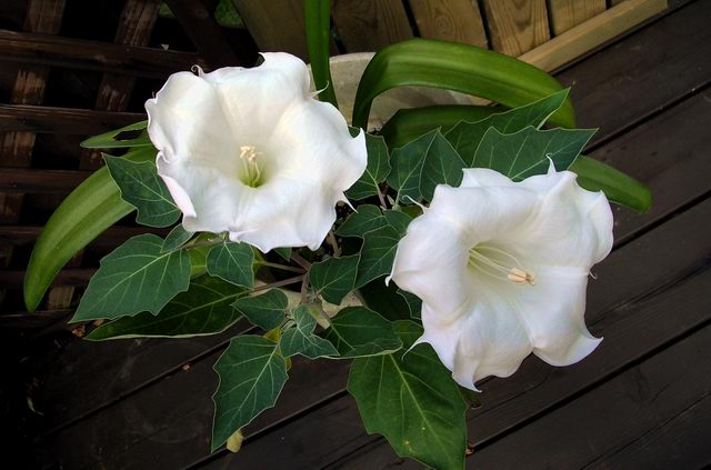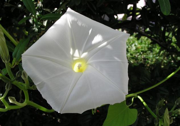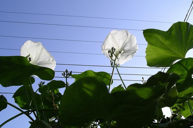 雲の多い午前中とよく晴れた午後。昨日よりは気温が高くなったけれど湿度が低く爽やかでした。9時から11時は恒例のテニス練習。2時間で3試合。終ってシャワー浴びて昼御飯食べて午後からダンス2時間。男性が少ないので休憩は3回に1回。自分の順番でなくても初心者と組むことが多いのでほぼ休みなしです。家に戻ってパソコンに向かうと眠気が襲ってきます。気がつくと画面開いたまま目が閉じて5分近く経過してることがあります。やはり無理しないで昼寝したほうがよさそうです。9日17時45分西洋アサガオ