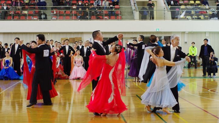 7時にスタッフ全員が集合し競技会の準備を行いました。9時までは選手の練習時間。9時から選手、役員揃ってラジオ体操で身体を解しました。開会式は大会会長、市長、体育協会からの挨拶でした。9時半スタートで午前中はラテン、午後はスタンダードの熱戦が繰り広げられました。司会と連携しながら競技進行スクリーンの掲示、表彰式集合写真撮影、休憩時間(5分または10分)には他のスタッフと協力してフロアのモップ掛けなど。昼食休憩は30分。びっしり詰まった競技スケジュールは混乱なく進行し、すべてのプログラムが17時には終了しました。片付け、清掃、解散式が終わったのは18時半でした。