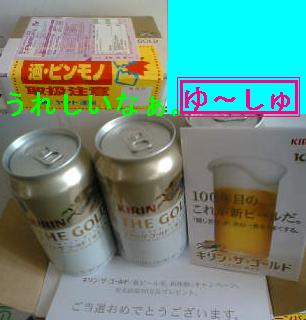 今日届きました。 3月20日発売の新ビール「新ビールを、新体験」キャンペーン(キリンビール)に応募したもの。発売直前30万缶プレゼントと言うのに当選したようです。 旦那が帰ってきたら飲んでみよう。と思います。ありがたや。 ☆☆飲みました☆☆ 「隠し苦味」って書いてあるのが気になりました。(苦いの苦手)一口目は確かに苦く感じましたが、その後は普通に飲み干せました。 旦那も「うまい!」と申しております。3月20日新発売!キリン ザ・ゴールド 350ml1本181円 1ケース24本から 24本単位でご注文ください