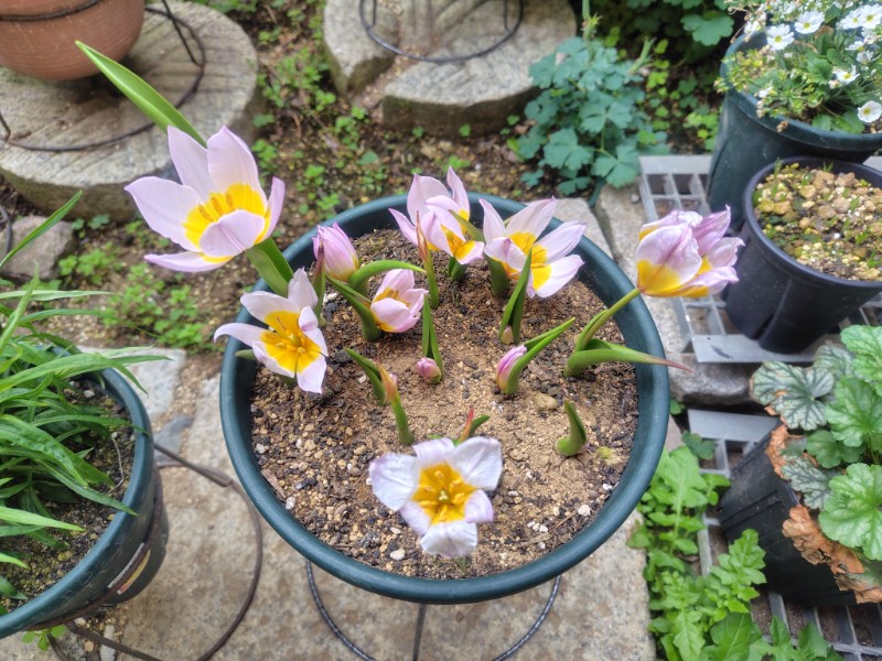 今シーズンは原種チューリップの球根を3品種植えましたが、希少品種とされる「アルバ コエルレア オクラータ」が最初に開花しました。6球植えて1つだけ咲きましたが、数日経っても開きはイマイチで残り5球も蕾が出てこないので、待ち切れず画像をアップしました。先に植え付けた「リトルビューティー」はまだ蕾も見えず、ムスカリ「タッチオブスノー」だけ咲き始めました。「ライラックワンダー」1つだけ蕾らしきものが見えますが…富山チューリップ5球は赤花3球、黄花3球のようですが、黄花の高さが残念賞。😓ヒヤシンス5球が咲き揃って甘い香りを放っています。スイセンも含めて過去イチ大量の球根を植え付けましたが、パフォーマンスはまちまちで思い通りにはいきません。