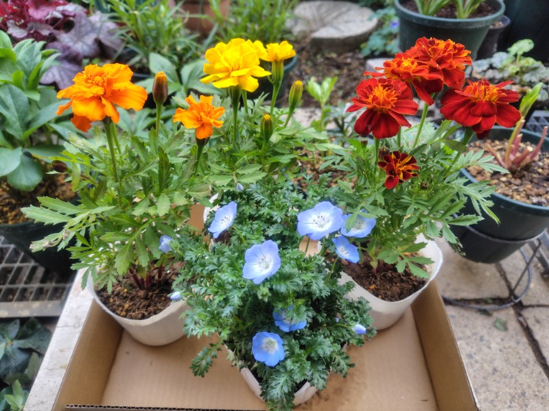 ニュースで国営ひたち海浜公園のネモフィラの映像を見るたびに「一度行ってみたいな」と毎度思うのですが実行に至りません。そこで、自宅にいながら行った気分が味わえるようにホムセンで苗を買ってきました。ネモフィラ158円ついでにマリーゴールド98円✕3苗も買いました。ネモフィラはショートリリーフなので、とりあえず宿根草エリアの隙間に植えました。今回、長年のガーデニング歴で初めてネモフィラを購入しましたが、こぼれ種でも殖えるようなので、これからは毎年お目にかかれそうです。😄さて、マリーゴールドの方は例年6月にチューリップ&ムスカリの後釜として植えているので、まだ地植え出来ません。かと言って、昨年のように事前に株分けで増殖を目論んで失敗するのも嫌なので…大和プラスチックの「ガレージコンテナ45型」というプランターを用意して植え付けました。一応、チューリップ終了後に地植えするまでの仮住まいの予定ですが、真夏に避暑のため移動することも可能なので、このまま行くことも視野に入れておきます。
