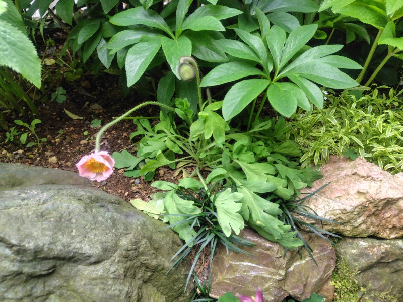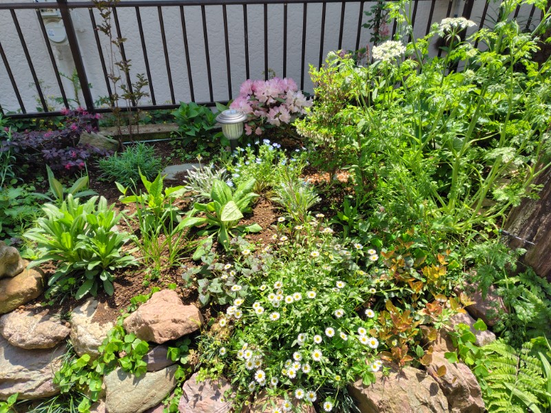 暖かく(暑く)なり加速度的に成長している宿根草エリアの住人たちです。一見、いい感じに見えるのですが…昨年11月に植えたオルラヤ「ホワイトレース」が一年草の分際で後ろのドウダンツツジを凌ぐほど巨大化してしまいました。😱まだ開花して数日ですが、こぼれ種で殖えたら大変なことになるのは必至なので…即断即決で引っこ抜いて処分しました。💀跡地に何か植えようと思いましたが、既に冬越ししたサルビアが大きくなっていたのでやめておきます。