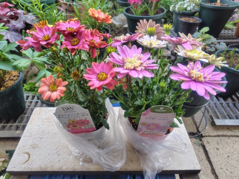 昨年7年振りにオステオスペルマム(しかもPWの)を購入するも不発弾に終わってしまい、もう二度と買うまいと思っていましたが、本日いつもホムセンでオステオスペルマムが半額セールだったので性懲りもなくお持ち帰りしてしまいました。😅左:PW「キャンディフィールズ(ベリーズパイン)」右:ハクサン「ラブポーション」どちらも398円→200円キャンディフィールズは昨年のリベンジですが、失敗を繰り返したくないので、植え付け方法を熟慮した結果…鉢植えではなく地植えにしました。雨に当てないようにするなら鉢植え一択ですが、この場所は夏に木陰になるので夏越し管理を優先しました。8年前はこの石段の下で育てていましたが、今回は石の上で水はけも良く条件は整っているはずですが、果たしてどうなることやら?