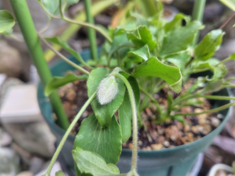 先月購入したパテンス系「ドクターラッペル」ですが、1週間前に新芽が出てきたと思ったら、早くも蕾まで出てきました。😳ツルもほとんど伸びず低い位置での蕾となりました。蕾が早くても嬉しくない株姿…😓今後温かい目で見守っていきます。