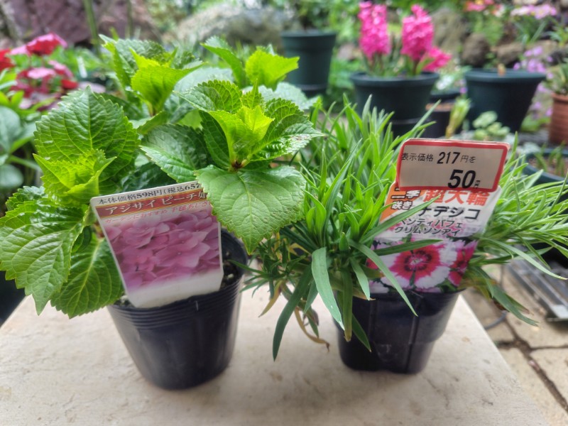 最近ご無沙汰だったいつものホムセンの別店舗にて運命の出会いが二つありました。左:アジサイ「ピーチ姫」の未開花苗598円右:ナデシコ「ベンティパフェ(クリムソンアイ)」217円→50円!アジサイについては、先月2年目株たちの芽が飛んで咲かないかもと危惧していたことが現実味を帯びてきたのと、地植えの名無しピンク株の生育がイマイチなので「ピーチ姫」を購入しました。🍑ナデシコの方は「二季咲き超大輪」「50円」のラベルと苗の状態を見て救ってあげました。ナデシコはソーラーライト左の河原ナデシコ「ミーティアピンク」が元気なので右側に植え付けました。「ピーチ姫」の花芽は5つあって、根鉢は崩さず6号スリットポットに植え付けました。左側の先輩アジサイたちより立派で、1年間の苦労は何だったのか考えてしまいます。😓とりあえず「保険」は確保したので、あとは先輩たちの奮起を期待します。