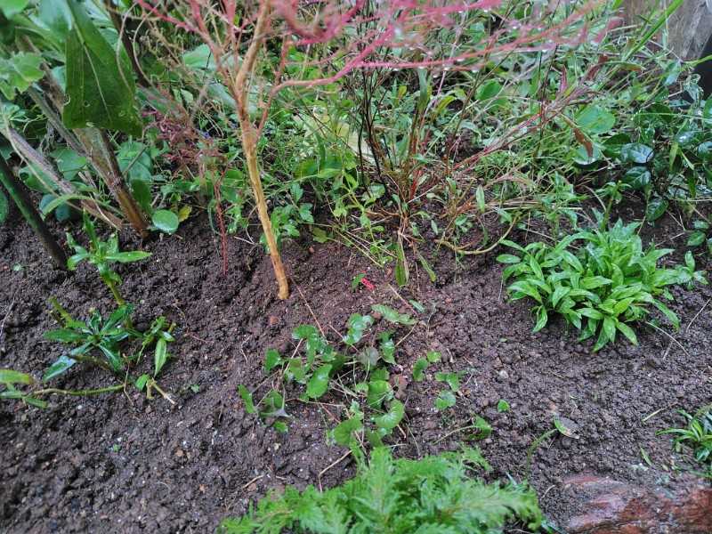 宿根ビオラ「ラブラドリカ」を挟んで左に「ピンクアドット」、右はエリゲロンを抜いた跡地に「ウルトラピンク」を植え付けました。