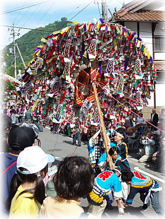 大きな傘の形をした山車を装飾し、男達数人がかりで担ぎます。