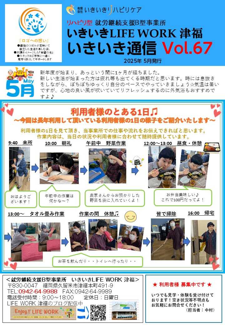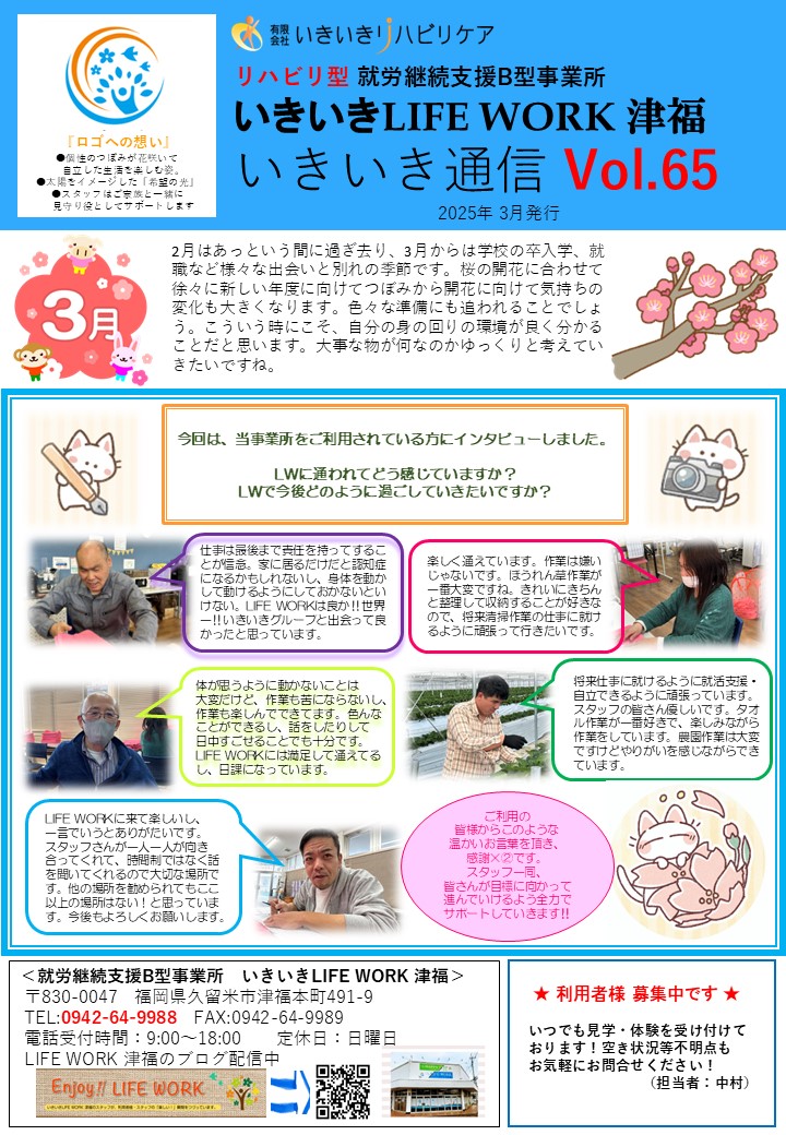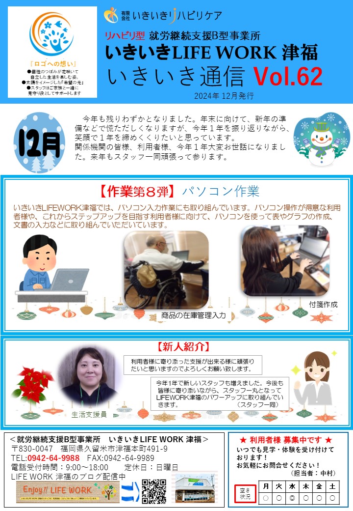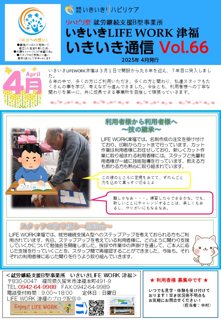 長い間投稿が止まっておりました。。待ってくださっていた方・・・申し訳ありません。そして、いつも見て下さってありがとうございます^-^♪久しぶりの投稿となってしまいましたが・・・いきいきLIFEWORK津福は、利用者様・スタッフ一同、力を合わせてバリバリ働いております!あっという間に今年度が始まり、新しいスタッフも入り、就労継続支援B型としてより一層良い環境にするため切磋琢磨しております!少しずつではありますが、今後もいきいきLIFEWORK津福の様子をお伝えできればと思いますので、これからもお時間がある時にでも、覗いていただければと思います^0^♪また、このブログを読んでいただき、気になられた方はいつでも事業所でお待ちしております♪お気軽にご連絡ください♪今回は、5月号のいきいき通信です☆ぜひ、ご覧ください!!お知らせいつも当Blogをご覧頂きありがとうございます!★いきいきリハビリケアでは、共に働く仲間を募集しています★~仕事が気になる方、求職中の方はこちらから~いきいきリハビリケア リクルート(求人)サイト★会社案内(会社の事が気になった方はこちら)★〜いきいきリハビリケア公式サイト〜★いきいきリハビリケアの仲間もBlogを書いています★~スタッフ仲間のBlogはこちらから~スタッフ仲間のBlog★いきいきリハビリクリニックで内科・リハビリテーション科の診察・リハビリが出来ます★※90分のデイケアもあり個別対応でリハビリ出来る。~風邪や高血圧、膝痛・腰痛等で受診・リハビリ希望される方はこちら~いきいきリハビリクリニックHPアクセスお待ちしております!