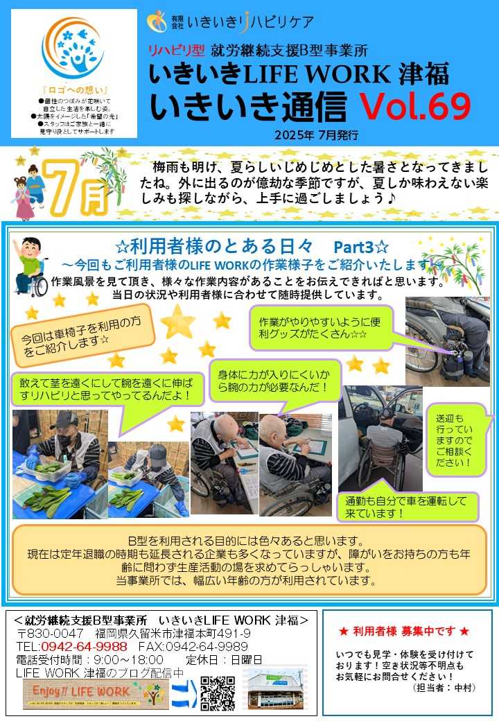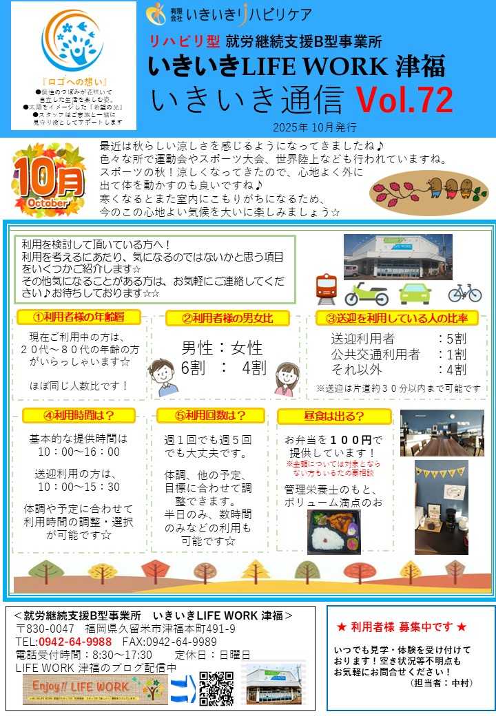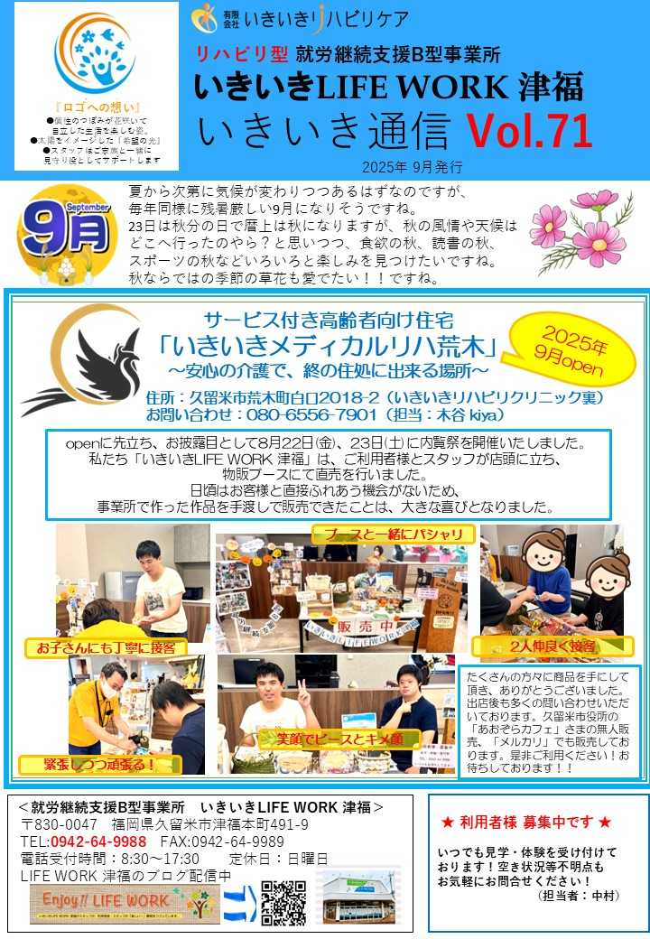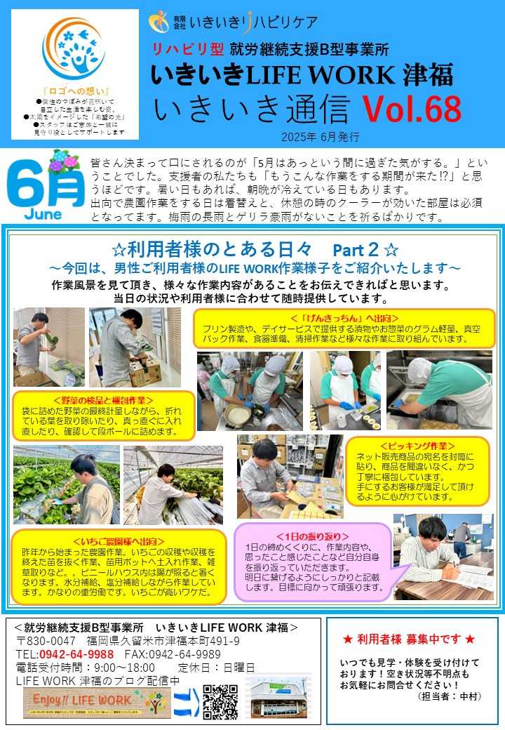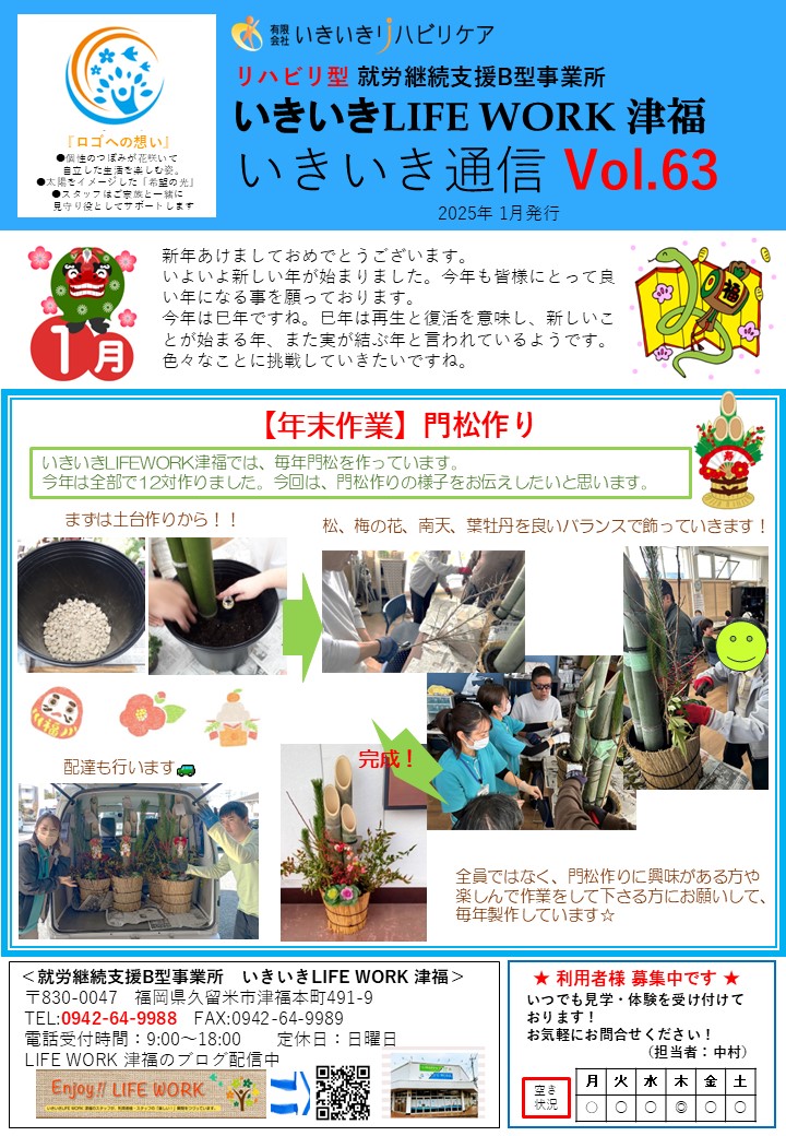 長い間投稿が止まっておりました。。待ってくださっていた方・・・申し訳ありません。そして、いつも見て下さってありがとうございます^-^♪久しぶりの投稿となってしまいましたが・・・いきいきLIFEWORK津福は、利用者様・スタッフ一同、力を合わせてバリバリ働いております!あっという間に今年度が始まり、新しいスタッフも入り、就労継続支援B型としてより一層良い環境にするため切磋琢磨しております!少しずつではありますが、今後もいきいきLIFEWORK津福の様子をお伝えできればと思いますので、これからもお時間がある時にでも、覗いていただければと思います^0^♪また、このブログを読んでいただき、気になられた方はいつでも事業所でお待ちしております♪お気軽にご連絡ください♪今回は、5月号のいきいき通信です☆ぜひ、ご覧ください!!お知らせいつも当Blogをご覧頂きありがとうございます!★いきいきリハビリケアでは、共に働く仲間を募集しています★~仕事が気になる方、求職中の方はこちらから~いきいきリハビリケア リクルート(求人)サイト★会社案内(会社の事が気になった方はこちら)★〜いきいきリハビリケア公式サイト〜★いきいきリハビリケアの仲間もBlogを書いています★~スタッフ仲間のBlogはこちらから~スタッフ仲間のBlog★いきいきリハビリクリニックで内科・リハビリテーション科の診察・リハビリが出来ます★※90分のデイケアもあり個別対応でリハビリ出来る。~風邪や高血圧、膝痛・腰痛等で受診・リハビリ希望される方はこちら~いきいきリハビリクリニックHPアクセスお待ちしております!