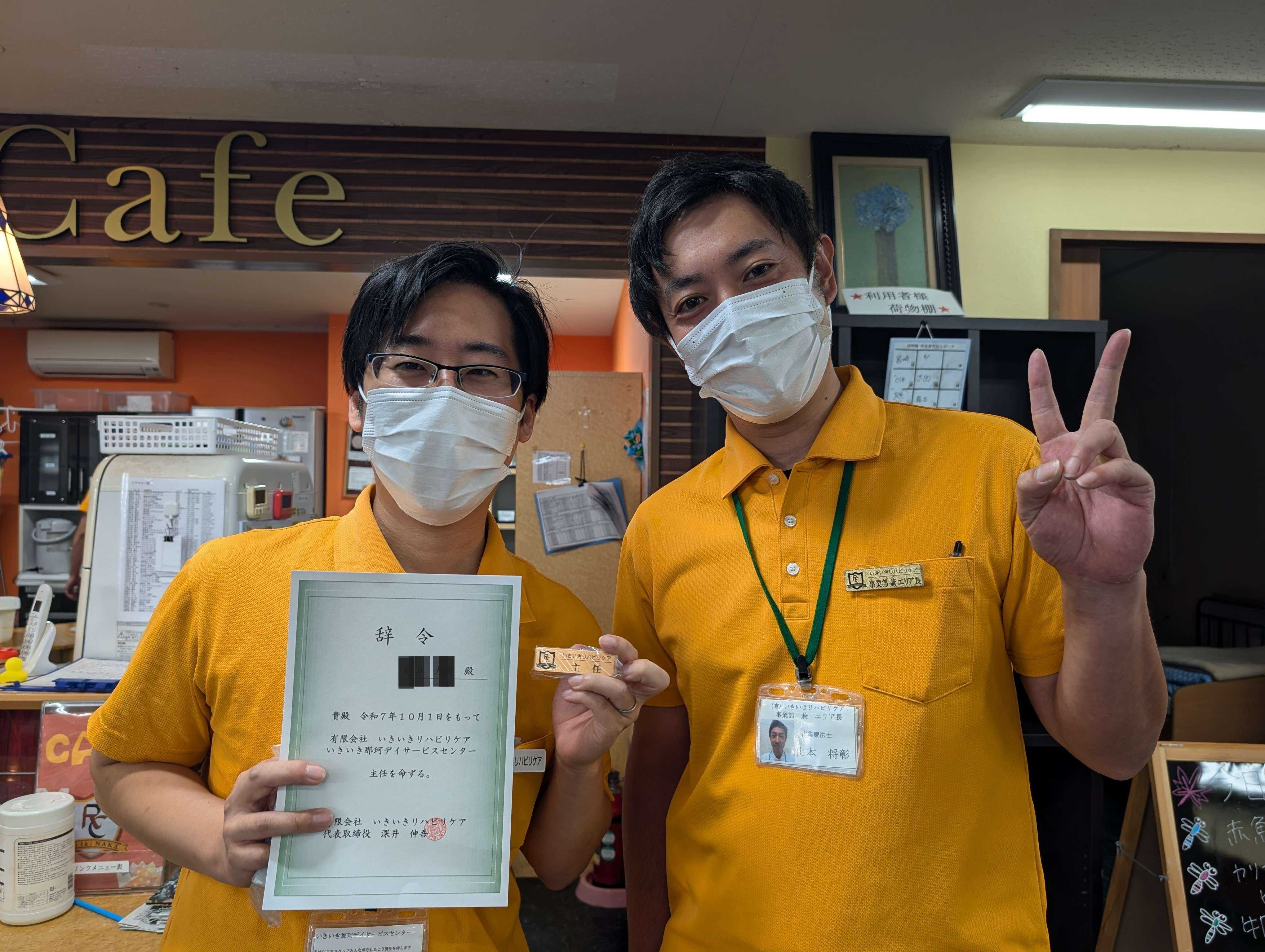 10月1日より下半期が始まります。当社では年に2度、役職や今の立ち位置からの次のステップに上がる為に昇格がこの半期に1度の頻度で実施されます。今回、私が実施させて頂いたのは以前私自身がセンター長として勤めていたいきいき那珂デイサービスセンターのM主任にでした。今回昇格したM主任とは、5年前に那珂に入職してきてくれて入職して2ヶ月目などにKセンター長と私と昇格したM主任と飲みに行かせて頂きました。それがもう5年前かと。その時に、Mくんは中途採用で介護未経験でしたが、役職を目指して頑張る人材での採用という所を伝えて、本人も「そこを目指して頑張る」と言ってもらってから5年。有言実行して、今回の昇格になって嬉しい限りです。この5年間は様々な自身の課題や初めての介護としての知識・技量など多くの事を学びながら、楽しい事もつらい事も多くあったと思います。ただ諦めずに、頑張り続けたM主任は人として素晴らしいなと思います!まだまだ道中半です。ここがゴールではなく、これから主任として利用者様の為には勿論ですがスタッフの為にも、奢らず、感謝を忘れず、主任としての何が必要か向き合っていってほしいと思います。ここからがスタートです。これからの頑張りを期待しています!お知らせいつも当Blogをご覧頂きありがとうございます!★いきいきリハビリケアでは、共に働く仲間を募集しています★~仕事が気になる方、求職中の方はこちらから~いきいきリハビリケア リクルート(求人)サイト★会社案内(会社の事が気になった方はこちら)★〜いきいきリハビリケア公式サイト〜★いきいきリハビリケアの仲間もBlogを書いています★~スタッフ仲間のBlogはこちらから~スタッフ仲間のBlog★いきいきリハビリクリニックで内科・リハビリテーション科の診察・リハビリが出来ます★※90分のデイケアもあり個別対応でリハビリ出来る。~風邪や高血圧、膝痛・腰痛等で受診・リハビリ希望される方はこちら~いきいきリハビリクリニックHPアクセスお待ちしております!