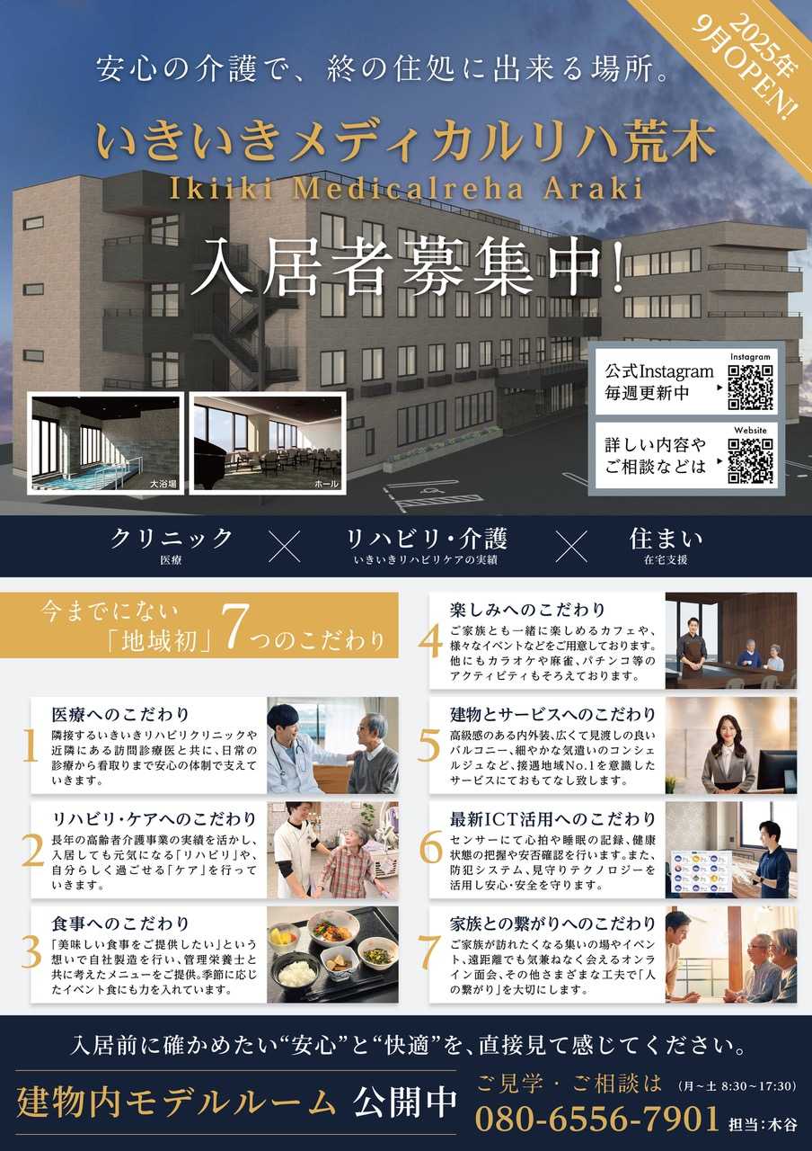 いきいきリハビリケアに2025年8月に「いきいきメディカルリハ荒木」(サービス付高齢者住宅)がOPEN予定となっています!様々なこだわり・サービスを提供できるプレミアムシニアマンションとなっています!■いきいきメディカルリハ荒木のこだわり■・医療へのこだわり →「隣接する いきいきリハビリクリニック」 ・食へのこだわり →「管理栄養士とともに考案した選択できるメニュー」 ・楽しみのこだわり→「カフェ・レストラン・大浴場・特殊浴槽、麻雀・パチンコルーム・カラオ ケ・アクティビティ(活動・習い事教室・レクリエーション、旅行(旅リ ハビリ倶楽部)」 ・建物とサービスのこだわり「高級感ある内装・専属のコンシェルジュを配置」 ・最新のICTを活用等今回は第一弾で「知ってもらう」為の発信となっています。これからより詳細な情報をチラシで第2・3段とブログでもお伝えしていき当施設の良さを発信できればと思います!※いきいきリハビリケアのHPでもチラシ等の情報を発信させてもらっています今後、施設をお考えの方やご興味のある方は是非、ご検討頂けたらと思いますお知らせいつも当Blogをご覧頂きありがとうございます!★いきいきリハビリケアでは、共に働く仲間を募集しています★~仕事が気になる方、求職中の方はこちらから~いきいきリハビリケア リクルート(求人)サイト★会社案内(会社の事が気になった方はこちら)★〜いきいきリハビリケア公式サイト〜★いきいきリハビリケアの仲間もBlogを書いています★~スタッフ仲間のBlogはこちらから~スタッフ仲間のBlog★いきいきリハビリクリニックで内科・リハビリテーション科の診察・リハビリが出来ます★※90分のデイケアもあり個別対応でリハビリ出来る。~風邪や高血圧、膝痛・腰痛等で受診・リハビリ希望される方はこちら~いきいきリハビリクリニックHPアクセスお待ちしております!