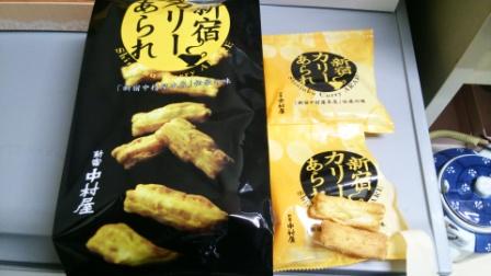 職場のお土産ゾーン(←勝手に命名していますが)に…前回と出だし文が一緒やないかいっ!ひねりなさいよっ!!んーなんとも恵まれた職場だ…日替わりで銘菓のお土産があるなんて。因みにワタクシの沖縄土産のちんすこう詰め合わせは???新宿中村屋は残念ながら知らんのですが、パッケージの文言見る限り老舗の匂いがプンプン…昼飯食いそびれたんで早速食べようと袋を開けますと、スパイシーな香りプンプン!中はサクサクッとした軽い食感の揚げ煎餅でしてイケるぅぅぅ!!あっという間に一袋喰うてもーた…もう一袋…っなワケない!昼飯食べてないワタクシにこの味は罪です。はやく仕事終わらんかいなーっと、思いながらの仕事はツライぢょー!