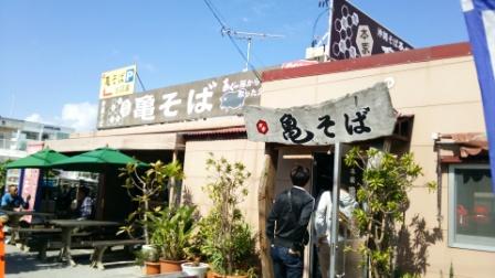 ハイサイ!沖縄にやってまいりました!!那覇空港に降りたちまして、目指すはホエールウォッチングの船待つ港です。しかし時刻は正午、長いクルージングの前に食事は必要ですので、港近くにあります老舗っぽいお店で沖縄の味覚を堪能します。沖縄そば屋さんであります。店内に入りますと券売機がありますので迷わず店名でもあります亀そばを注文!お昼時なんでお客さんでごったがえしておりましたが、大して待たされることもなく注文の品が到着!!店外に出まして、道に面したテラス席(というほどオサレ感はないが)で頂きます。店先の看板にもあった県産あぐー豚からとったダシ!!がこのお店のウリのようですが…福岡県人で日頃から豚骨ラーメンを喰いまくってますワタクシ、豚ダシよかカツオダシの方が明確に感じられまして、塩分を感じる味付けでした。まぁ2泊3日の沖縄旅行、折角ですのでウチナーの味を食べれるだけ食べたいと思います。