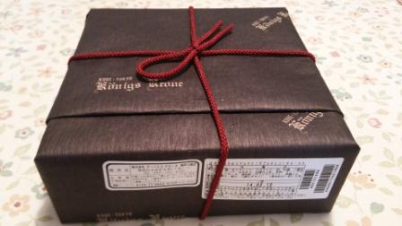 出産祝いのお返しを頂きました!本社が神戸にありますケーニヒ スクローネなる洋菓子屋さんの一品です。頂いた時から高級感の漂いっぷりを感じてましたが…開けても開けても梱包の連続…ロシア・ソチ五輪にちなんでマトリョーシカ風梱包かと思いつつ…やっとこさ中身に到達しました。写真ぢゃ大きさが伝わらない…因みにメーカー公表値は箱サイズが縦172×横172×高65(mm)。きちんと伝えるとなんか殺伐とした内容になってしまいました(汗)四の五の言わず食べましょう!頂きますっ!!折角の高級スイーツが…洋菓子をのせるような皿ぢゃなくてスンマッセン!メーカーアドバイスではそのままでも美味しく頂けますが、レンジで20秒程温めるとさらに美味しいとのこと。確かに…常温もさることながら温めますとコーティングのチョコがトロけてイイ感じ!中にはデカイ栗がゴロゴロ入っておりまして、甘さもお上品であります!!ただ、頂いたのはワタクシなのに…嫁子供が喰いつくしてしまい…1/8程しか食べれなかった。こんなこと許されるのかっ?!