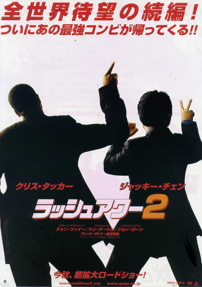 第一作を観て続編は是非吹き替えで観たいと思っていた「ラッシュアワー2」ですが…今作も字幕スーパーでの鑑賞となりました前作同様(モチロンですが)ジャッキー・チェン&クリス・タッカーのタッグで贈るアクションコメディ作品休暇で香港滞在のロス市警のカーターは、ロスでの事件で親友となった香港警察のリーと香港の夜を楽しんでいたのですが、在香港米領事館の爆破事件を追うハメになり、ついにはロサンゼルスにまで飛ぶことに…最後は100ドル札の超精密な偽札問題までに発展し、巨大カジノを巻き込んでの大捕物になります毎度相変わらずのでたらめ設定なジャッキー映画ですが、そんなことに目くじらを立てていては彼の作品は楽しめませんっ今回も最初から最後までジャッキーの体と、タッカーのマウスが躍動しまくりまして息つく間もない90分でありました。しかし…2001年の作品ですが悪役登場のジョン・ローンのフツ-のおっさん容姿にガッカリ…「イヤー・オブ・ザ・ドラゴン」でのアノかっちょいい容姿はどこへ…まぁハリウッドスターも人の子ですそんでもって、もう一人の悪役さんチャン・ツィイーですが、エンディング恒例ののNGシーンでのハニカミっぷりが超可愛いかったです貴方には悪役は似合いませんっ