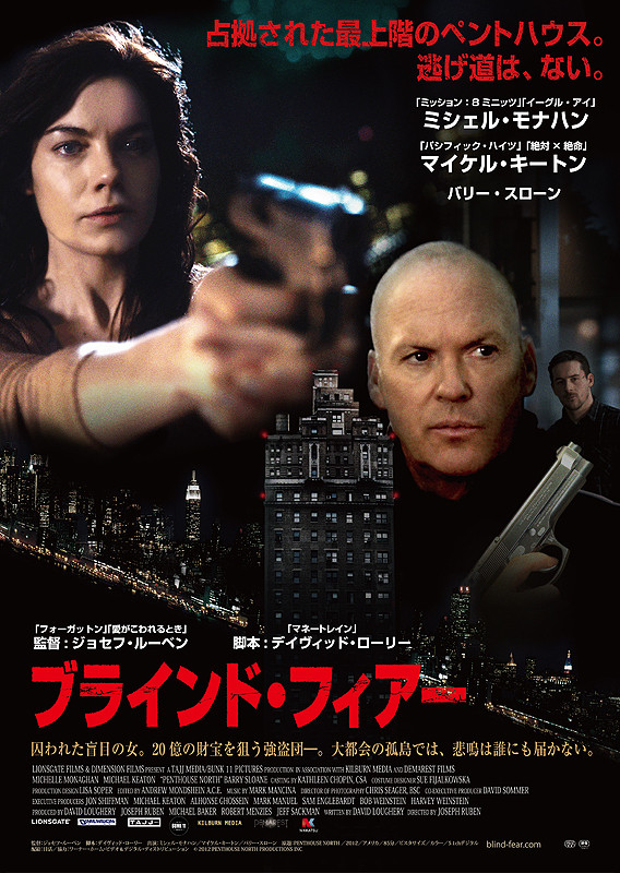 本日観ました作品は、元戦場カメラマンで失明したヒロインが自宅に侵入した2人の犯罪者に監禁されてしまうというサスペンススリラーです絶望の状況下で盲目のヒロインは、犯人達と決死の攻防を繰り広げるワケなんですが…内容としましてはそこそこだったかな主演は「ミッション:8ミニッツ」や「イーグル・アイ」に「ミッション:インポッシブル3」等の大作でのヒロイン役が多いのミシェル・モナハン。もしや今作は彼女にとっての初主演作なんでしょーか悪役には「バットマン」シリーズでダークヒーローを演じたマイケル・キートンが起用されまして、「SAW(ソウ)」の猟奇殺人鬼ジグソウみたいな強烈な悪キャラを演じてます。正直なところ、あまり見どころがない作品でしたが…ヒロインは中東での戦場取材中に自爆テロで失明してしまうという設定でして、この部分に引っかかるところが。折しも今は中東シリアで日本人が拉致されている状況で、イスラム=テロってな方程式が当たり前に思われている世相ではないかと…そんな中での鑑賞でしたので、ヒロインが失明に至る過程が自爆テロぢゃなくてもねーっとオープニングシーンを見ながら感じておったのですが、この設定がラストの対決シーンに繋がるとは思わずにチョビっと感心脚本って大事やねーっと感心した1本となりましたとさっ