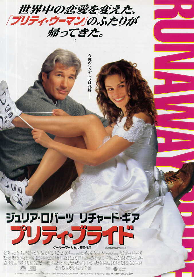 大ヒットしたラブコメ映画「プリティ・ウーマン」の黄金コンビ、リチャード・ギアにジュリア・ロバーツ、ゲーリー・マーシャル監督が放ったプリティシリーズ第2弾を観ました…因みにですが、邦題は「プリティ・ブライド」ですが原題は「RUNAWAY BRIDE 」なんで第2弾ぢゃありませんですタイトルにプリティをつけたのは全く持って日本での興行上の戦略でしょうが、ジュリア・ロバーツの相変わらずのプリティさで許すとしましょう主人公はリチャード・ギア扮します辛口コラムニストでして、結婚式の最中に逃亡をしてしまう女性の記事を書いたところ、本人からの猛抗議で連載のコラムを打ち切られる目に合ってしまいます。失職した彼は、ジャーナリスト生命を賭け地元に乗り込み、折しも4度目の結婚式を控えたジュリア・ロバーツ演じますランナウェイ・ブライドの取材を開始するのですが…といった筋書き。まぁ、結末は主演の二人をみれば一目瞭然でして、ハッピーエンドで万々歳ラストはニューヨークの夜の街並みをバックにペントハウスでの愛の告白でして、NOっとほざくやつがおるなら出てこいやと言いたくなる贅沢なシーンです笑いもあり、ちょっとした感動にブラックなジョークまで上手い具合に盛りこみまして、ジュリア演ずる許されざる我ままランナウェイ・ブライドを中和してくれた、アクのない良く出来たラブコメディ作品。相変わらずチューが美味―なリチャードさんよっと同棲を羨みましてこの作品の感想はこれにてお終いっ
