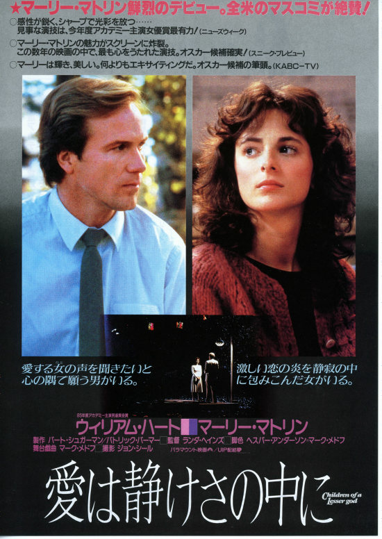 時刻は間もなく0時…実は嫁さんが酷い食あたりで入院しまして家事全般をハイテンションで済まし今を迎えておるのですが、眠れず映画鑑賞と相成りました牡蠣が作ってくれた静けさに中で…観ますは「愛は静けさの中に」です(嫁に失礼か)20年以上前に観た記憶の作品でして、アカデミー主演女優賞を獲ったヒューマンラブストーリーろうあ学校へ赴任した男性教師が、そこで清掃の仕事をしている女性と出会います。実は彼女は生まれつきの完全ろうあ者で、少女時代の体験から全ての人に心を閉ざしているのですが、恋してしまった教師は告白をし、二人の恋がスタートする…ってなお話です。この後、当然なんですが二人の間で乗り越えなければならない諸問題が降りかかってまいりましてドラマを盛り上げます。この作品で主演を務めましたマーリー・マトリンは、実生活でも耳が聞こえない女優さん。当時、彼女を起用した背景はわかりませんが、作品中でもろうあ者への偏見の目等を赤裸々に映しておりまして社会に訴えかける意図もあった作品だったのではと思いました。彼女については、この作品の前後で目立った作品を知らないのですが、劇中で見せたすさまじいスピードの手話の演技(ぢゃないんですが)は、演ずる女性の性格や感情を見事に表現してまして、初主演でオスカー像を手にした快挙も納得そして心配の手話によるセリフ回しも、相手役のウィリアム・ハートを上手に使って手話訳をさせるなど考えた演出でしてGOODでありました1986年公開の作品ですが、未来永劫に引き継いでもらいたい作品だと思います
